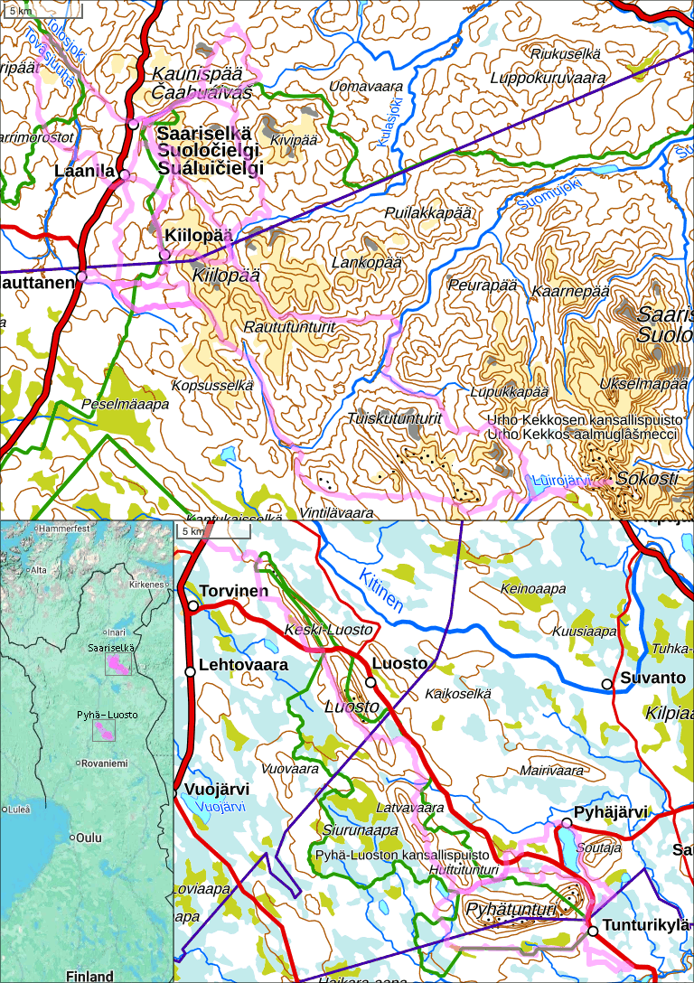 Routes: (1) Pyhätunturi – Luosto – Vaiskontie (bus stop); (2) Saariselkä – Luirojärvi – Sokosti mountain – Kakslauttanen; ~300 km in 7 days